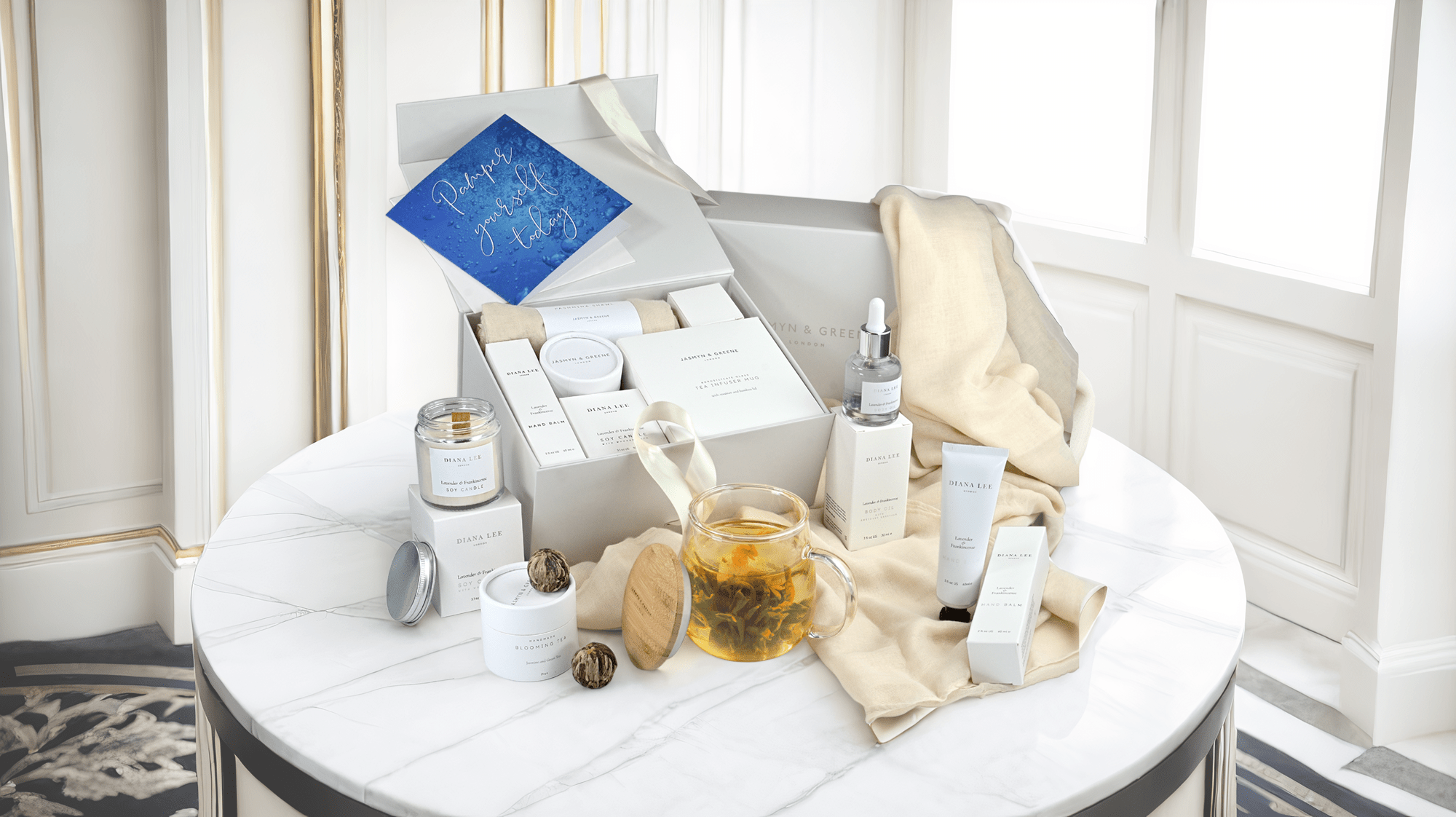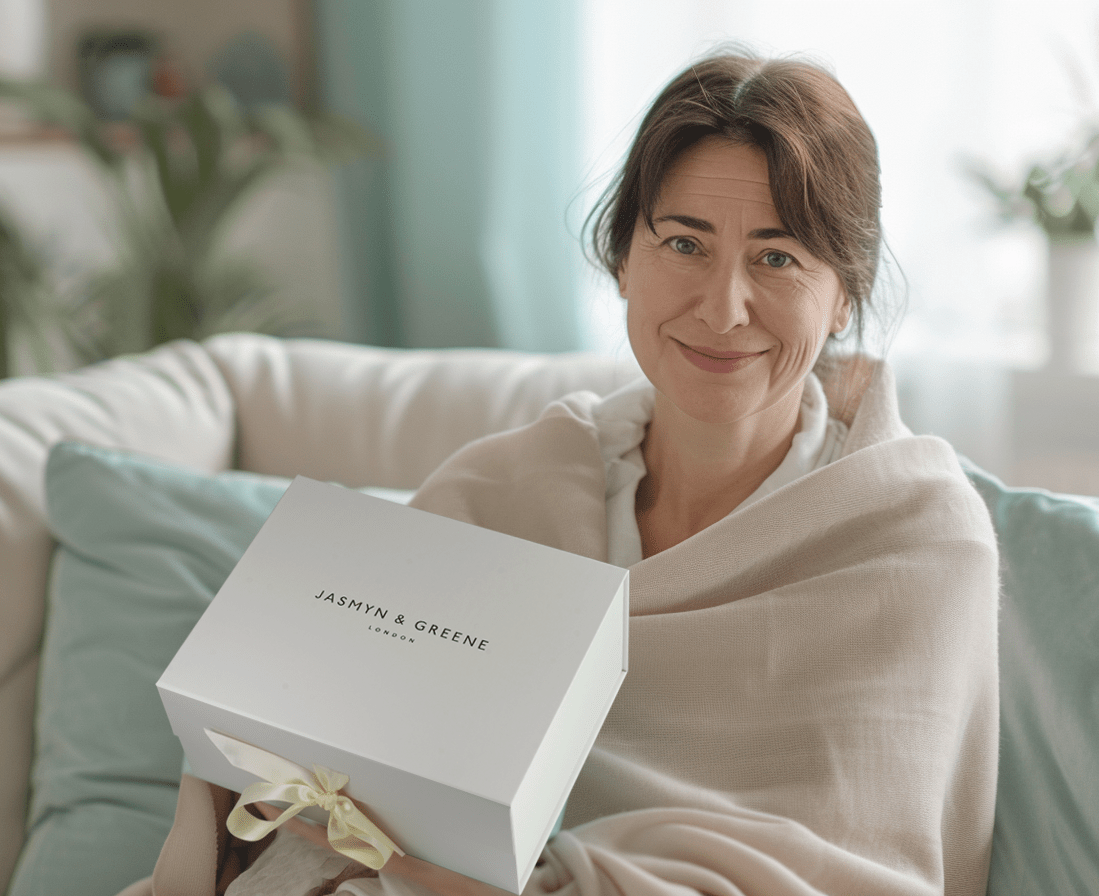 The indulgence extends beyond tea with premium skincare products by Diana Lee—featuring a rich hand balm and nourishing body oil—and a calming lavender-scented soy candle with a wooden wick to create an ambience of serenity. Wrap yourself in the comforting embrace of a luxurious pashmina shawl, completing this set as a symbol of warmth and style. Ideal for both personal indulgence and thoughtful gifting, the Jasmyn & Greene Tea Gift Box embodies our philosophy: transforming life's simple pleasures into cherished moments of luxury.